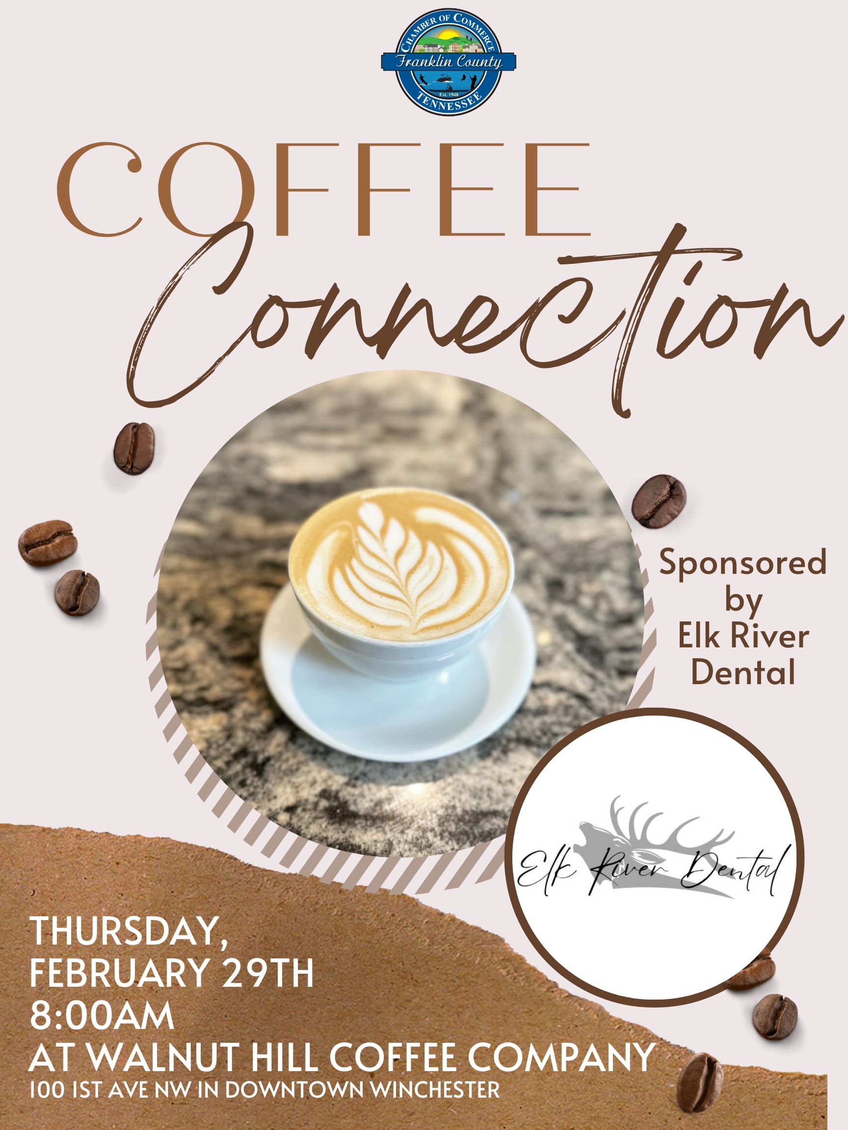 Please make plans to attend our Chamber Coffee Connection at Walnut Hill Coffee Co. on Thursday, February 29th at 8 am. ☕️ Join us as we hear from our Event Sponsors - Elk River Dental, spotlight our new members, and allow time for networking with those in attendance. No matter how long you've been a member, we invite you to join us and make some connections with business owners in our area. Please take a quick moment to RSVP so that we can prepare food and space accordingly.