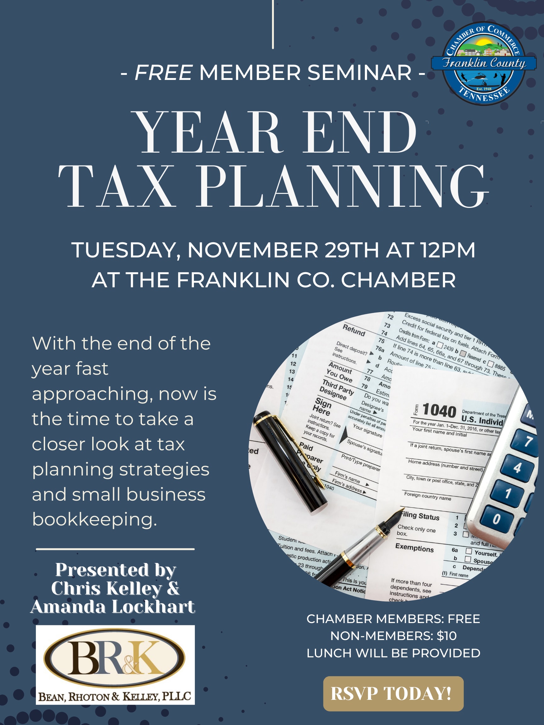 Join us on Tuesday, November 29th at noon for a FREE *Member Seminar* on Year-End Tax Planning. With the end of the year fast approaching, now is the time to take a closer look at tax planning strategies and small business bookkeeping! Lunch will be provided. Presented by Chris Kelley & Amanda Lockhart of Bean, Rhoton & Kelley, PLLC.Images