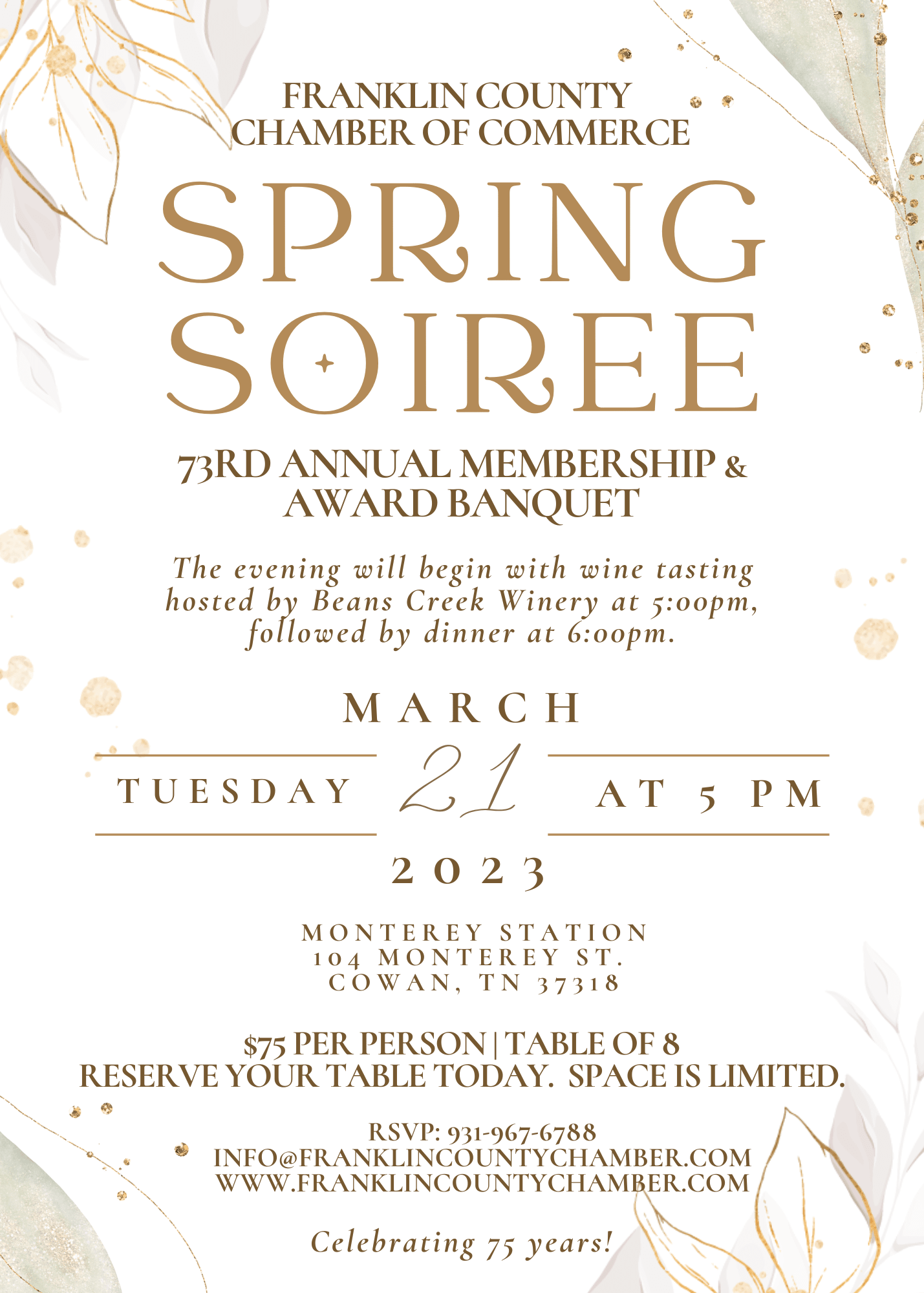 Join us on March 21, 2023, at Monterey Station in Cowan to celebrate our Chamber members and local businesses. We will be announcing our end of year awards during the event, so be sure to get us your nominations in for small/big business of the year, citizen of the year, outstanding young person. Tickets are $75 per person - Tables of 8 - Social time will begin at 5pm, with dinner following at 6pm. We are offering a wine selection from Beans Creek Winery. All wines must be pre-ordered prior to the banquet. We will not be offering on-site selling of wine.